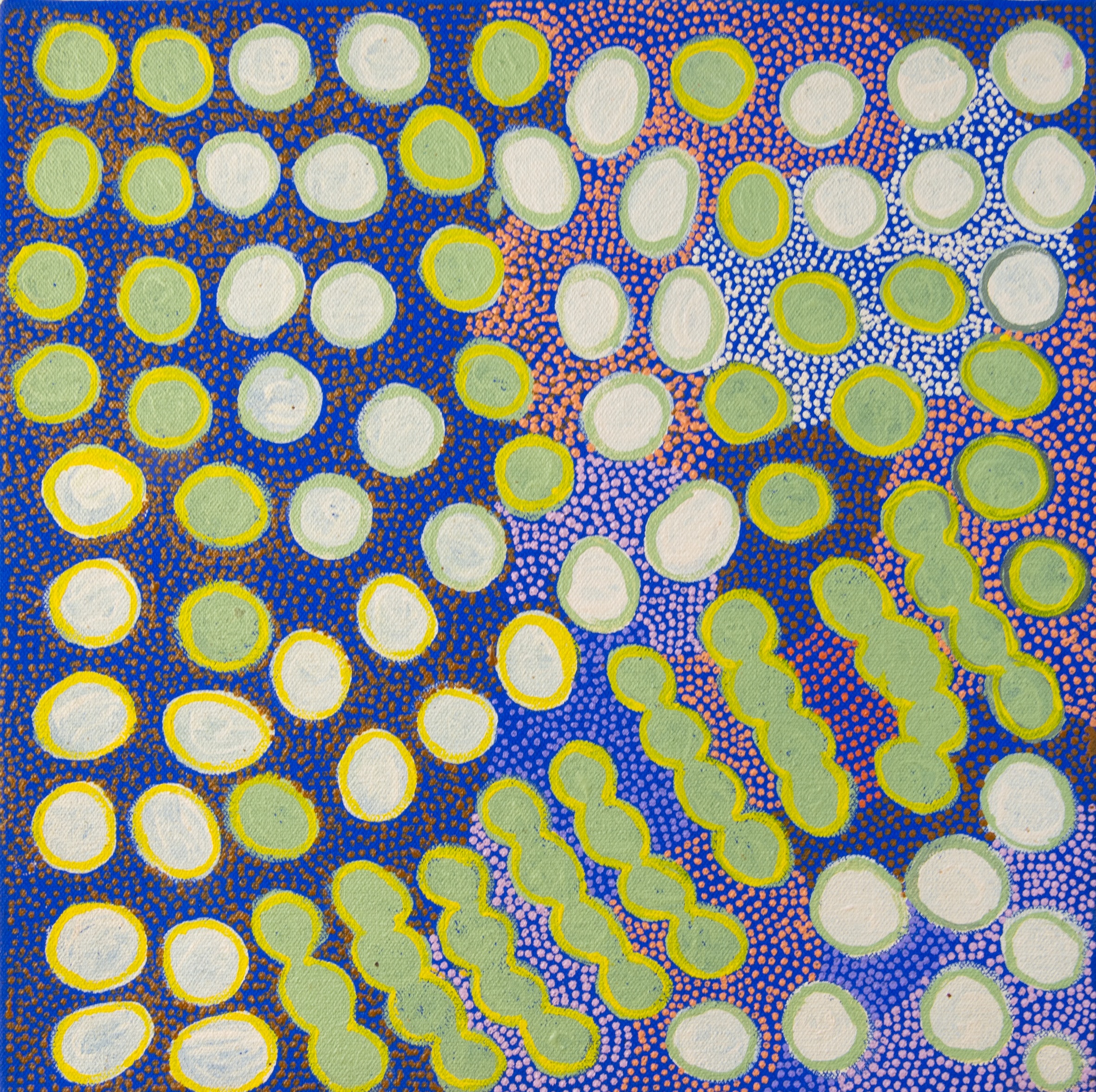 In this painting Punata has painted the bush food Yala (Sweet Potato) that is found in the sand dunes near her country Mt Denison. Her father Billy Stockman Tjapaltjarri also painted the country around Mt Denison. Women dig for for the sweet potato in the sand dunes and cook it in the coals of the fire. The Yala (Sweet Potato) is white in colour and sweet in taste.